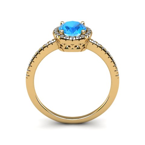 This stunning gemstone and halo diamond ring features one 8x6mm oval shape blue topaz gemstone at 1.50 carats. It is surrounded by 40 sparkling diamonds in a halo and down the band in I-J color, I1-I2 clarity at 0.20 carats. Total gem weight is 1.70 carats. This ring is crafted in 14 karat yellow gold.