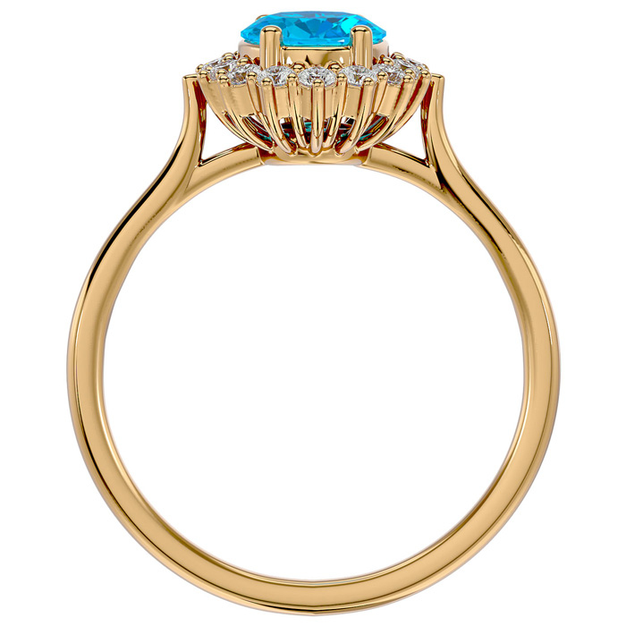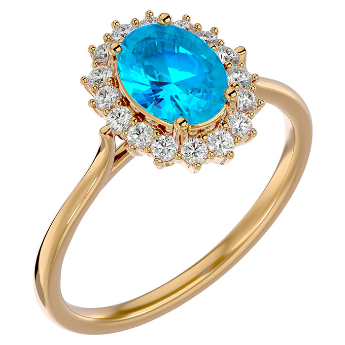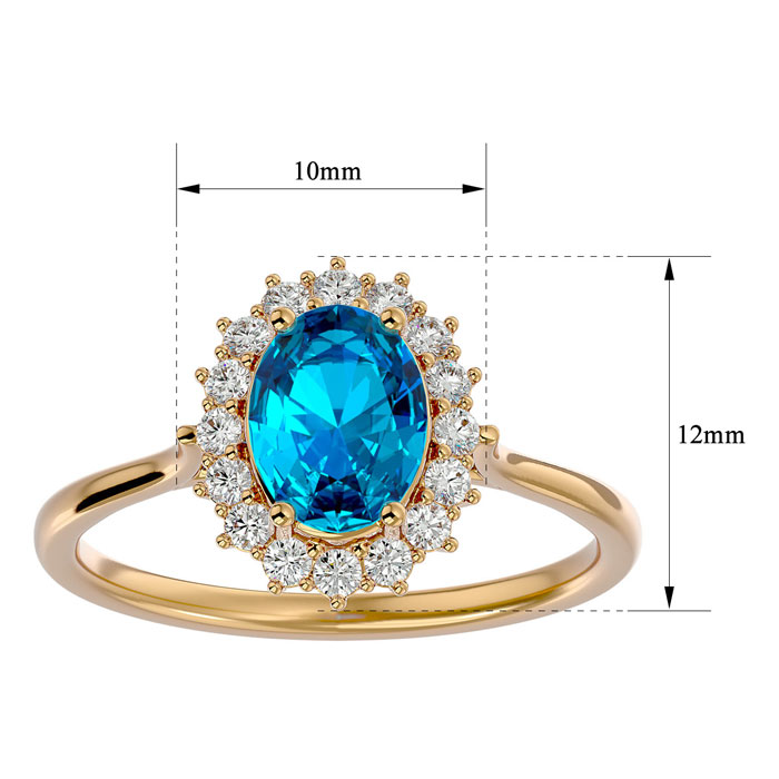 This elegant gemstone ring features one 8x6mm oval shape blue topaz gemstone at approximately 1 1/2 carats. It is surrounded by 16 sparkling diamonds in I-J color, I1-I2 clarity at 1/4 carat total weight. Total gem weight is approximately 1 3/4 carats. This ring is in 14 karat yellow gold.