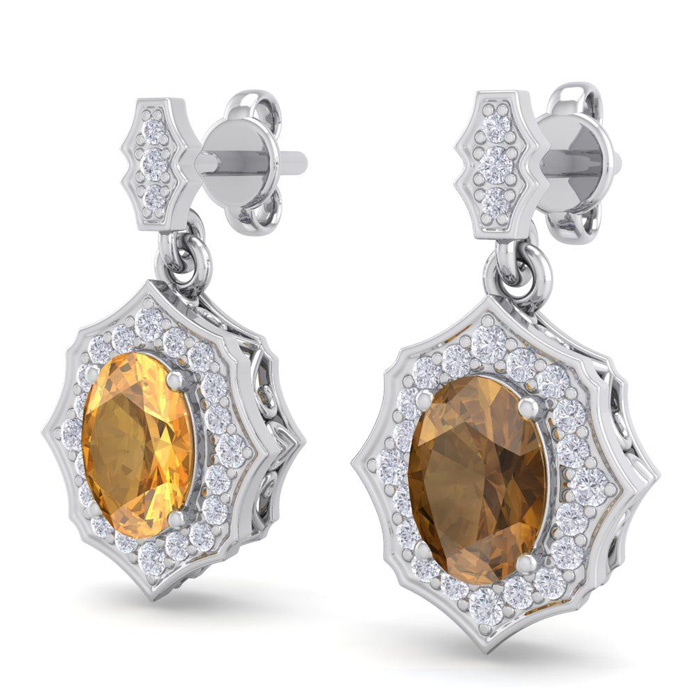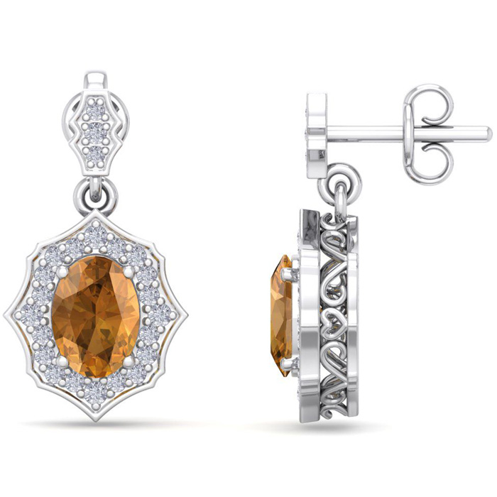 These elegant gemstone earrings feature two 7x5mm oval shape citrine gemstones at approximately 1.60 carats. They are surrounded by 46 sparkling diamonds in I-J color, I1-I2 clarity at 1/4 carat total weight. Total gem weight is approximately 1.85 carat total weight. These earrings are in 14 karat white gold and have comfortable and secure friction backs. Each earring dangles down 3/4 inch. *Retrograde Birthstones™ flips the idea of traditional birthstones. Wear your ½ birthday birthstone, your Retrograde Birthstone, “The Birthstone For Your Bad Side™.