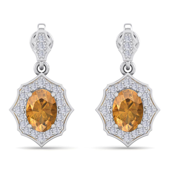 Retrograde Birthstones™ 1 3/4 Carat Oval Shape Citrine and Diamond Dangle Earrings In 14 Karat White Gold