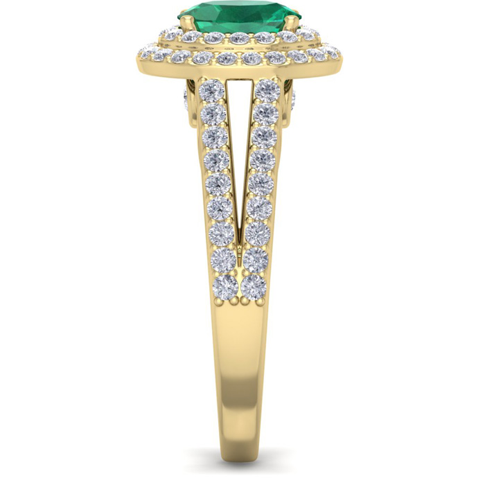 This elegant gemstone ring features one 7x5mm oval shape emerald gemstone at approximately 0.80 carats. It is surrounded by 76 sparkling diamonds in a double halo in I-J color, I1-I2 clarity at 1 carat total weight. Total gem weight is approximately 1.80 carat total weight. This ring is in 14 karat yellow gold. Ring top measures 10x8mm.