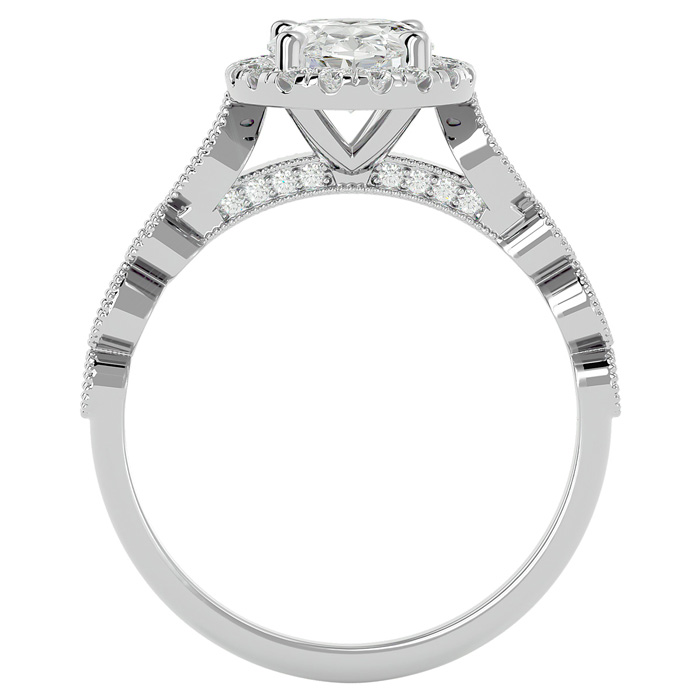 This fabulous lab grown diamond engagement ring features a sparkling 1 1/2 carat oval shape center lab grown diamond in G-H color, VS clarity. It is surrounded by 44 side lab grown diamonds totaling 1/3 carat. Total carat weight is 1 3/4 carats. This ring is in 14 karat white gold.