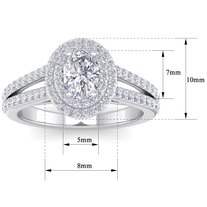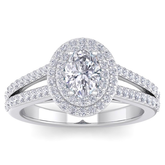 This elegant ring features one 7x5mm oval shape center at approximately 3/4 carat. It is surrounded by 76 sparkling lab grown diamonds in a double halo in G-H color, VS clarity at 1 carat total weight. Total gem weight is approximately 1 3/4 carat total weight. This ring is in 14 karat white gold. Ring top measures 10x8mm.