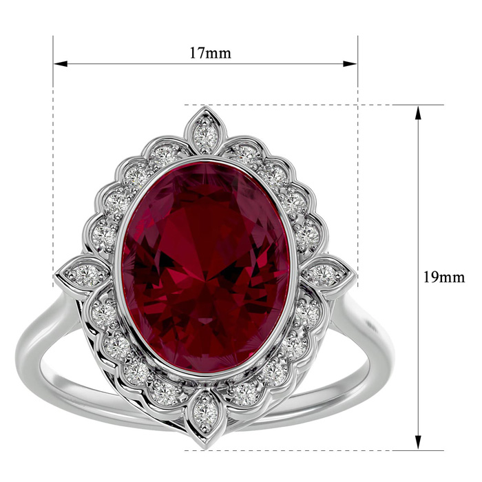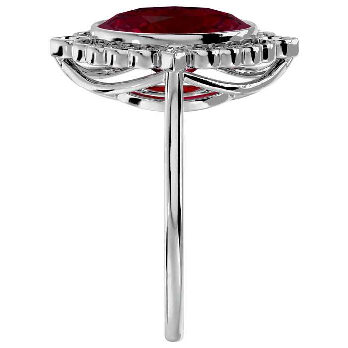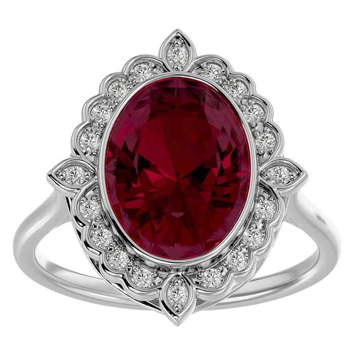 This elegant gemstone ring features one 8x6mm oval shape ruby gemstone at approximately 1.55 carats. It is surrounded by 20 sparkling diamonds in I-J color, I1-I2 clarity at 1/5 carat total weight. Total gem weight is approximately 1 3/4 carats. This ring is in 14 karat white gold.