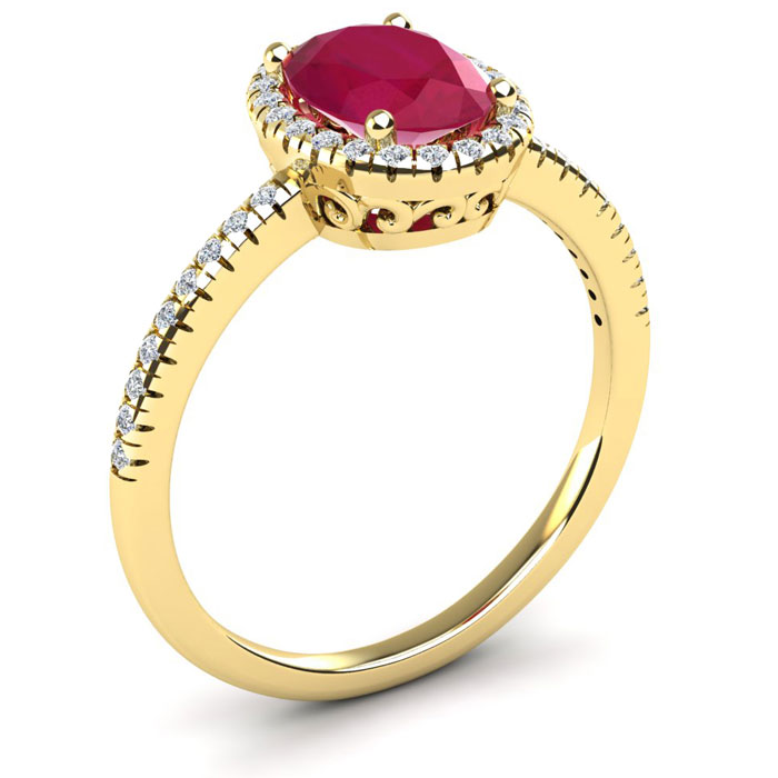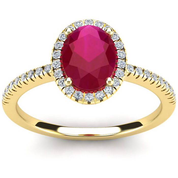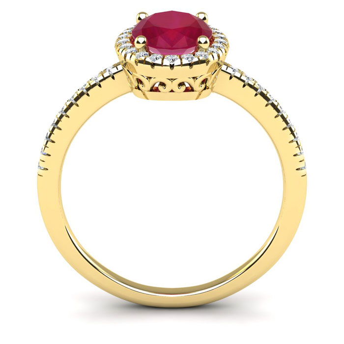 This stunning gemstone and halo diamond ring features one 8x6mm oval shape ruby gemstone at 1.55 carats. It is surrounded by 40 sparkling diamonds in a halo and down the band in I-J color, I1-I2 clarity at 0.20 carats. Total gem weight is 1.75 carats. This ring is crafted in 14 karat yellow gold.