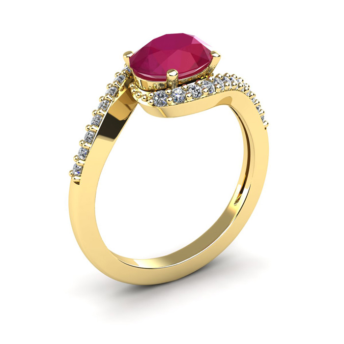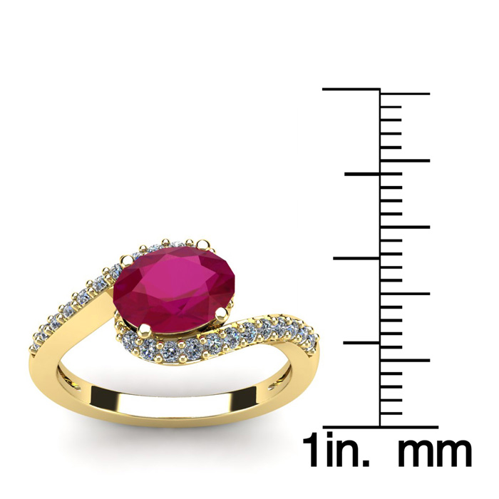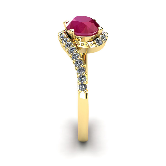 This stunning gemstone and diamond ring features one 8x6mm oval shape sideways ruby gemstone at 1.55 carats. It is surrounded by 30 sparkling diamonds in a halo in I-J color, I1-I2 clarity at 0.30 carats. Total gem weight is 1.85 carats. This ring is crafted in 14 karat yellow gold.