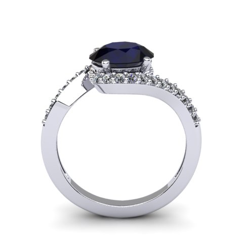 This stunning gemstone and diamond ring features one 8x6mm oval shape sideways sapphire gemstone at 1.60 carats. It is surrounded by 30 sparkling diamonds in a halo in I-J color, I1-I2 clarity at 0.30 carats. Total gem weight is 1.90 carats. This ring is crafted in 14 karat white gold.