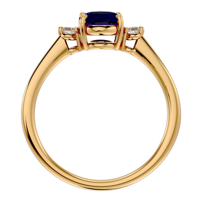 This elegant gemstone ring features one 8x6mm oval shape sapphire gemstone at approximately 1.60 carats. It is surrounded by 2 sparkling diamonds in I-J color, I1-I2 clarity at 1/10 carat total weight. Total gem weight is approximately 1.70 carat total weight. This ring is in 14 karat yellow gold.