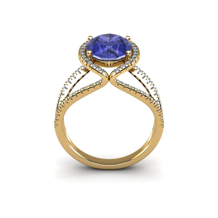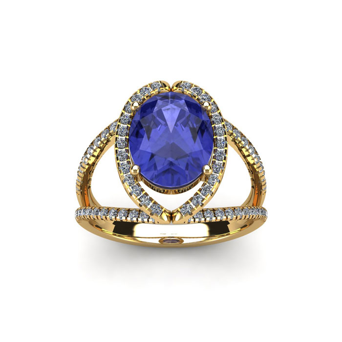 Retrograde Birthstones™ 1 3/4 Carat Oval Shape Tanzanite and Halo Diamond Ring In 14 Karat Yellow Gold