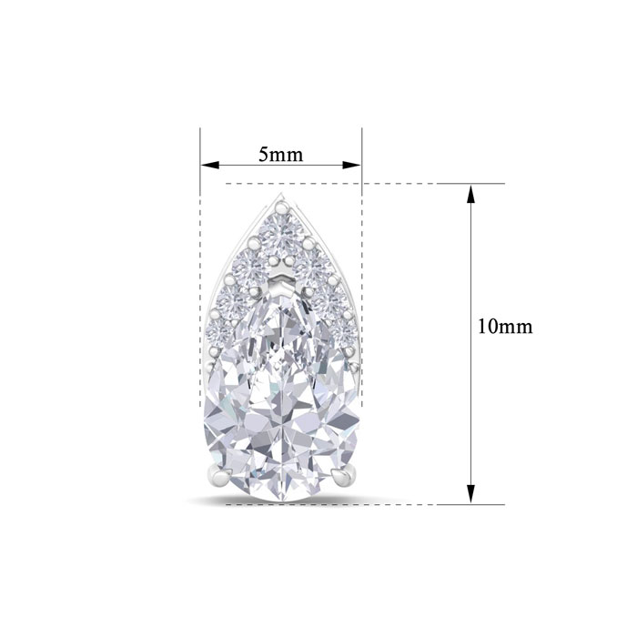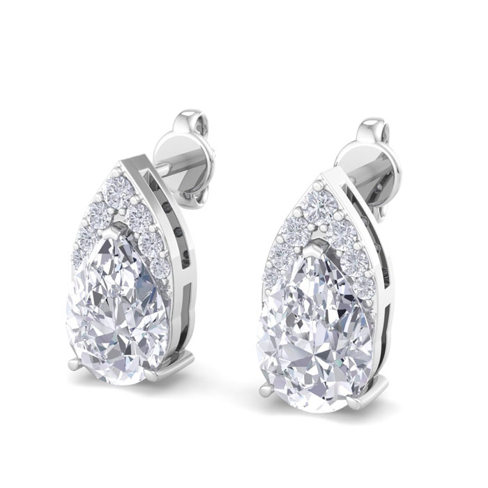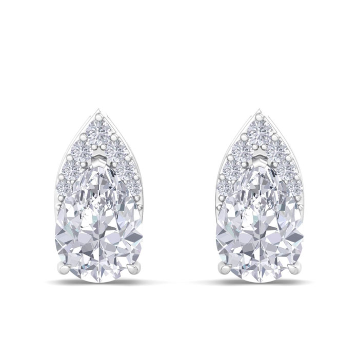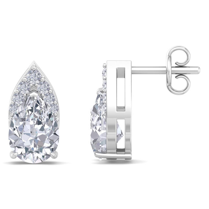 These lab grown diamond earrings feature 2 sparkling pear shape lab grown diamonds each weighing approximately 3/4 carats. They are surrounded with a crown of 14 lab grown diamonds totaling approximately 1/10 carat. Total carat weight is 1 3/4 carats. Diamond color is G-H, diamond clarity VS. These earrings are in 14 karat white gold and have comfortable and secure post with friction backs.