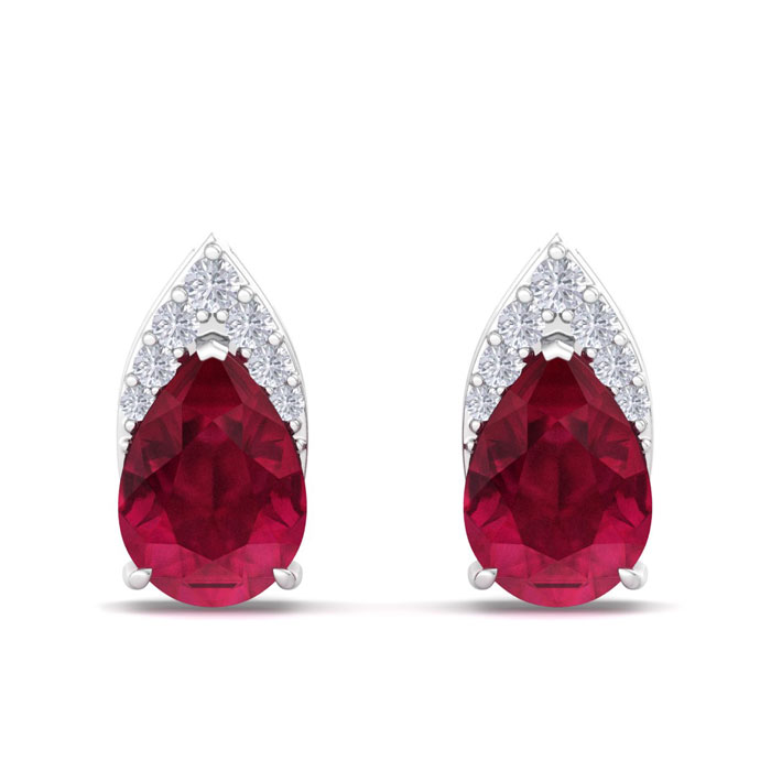 These gemstone earrings feature 2 sparkling pear shape created ruby gemstones each weighing approximately 3/4 carats. They are surrounded with a crown of 14 diamonds totaling approximately 1/5 carat. Total carat weight is 1 3/4 carats. Diamond color is I-J, diamond clarity I1-I2. These earrings are in 14 karat white gold and have comfortable and secure post with friction backs.