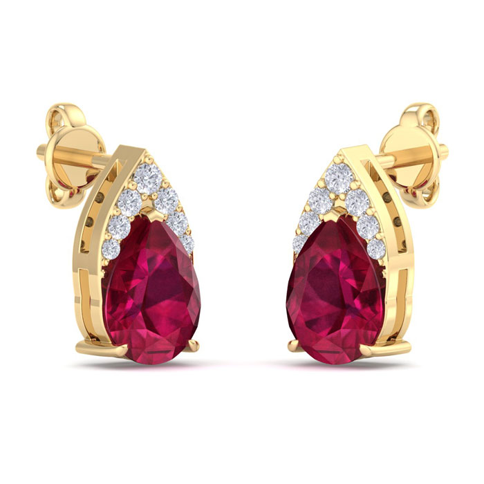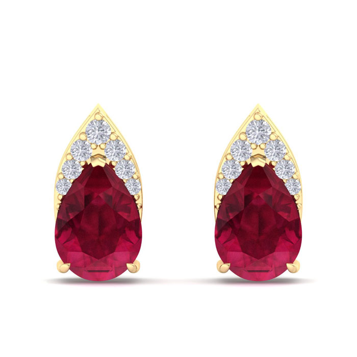 These gemstone earrings feature 2 sparkling pear shape created ruby gemstones each weighing approximately 3/4 carats. They are surrounded with a crown of 14 diamonds totaling approximately 1/5 carat. Total carat weight is 1 3/4 carats. Diamond color is I-J, diamond clarity I1-I2. These earrings are in 14 karat yellow gold and have comfortable and secure post with friction backs.