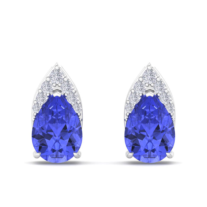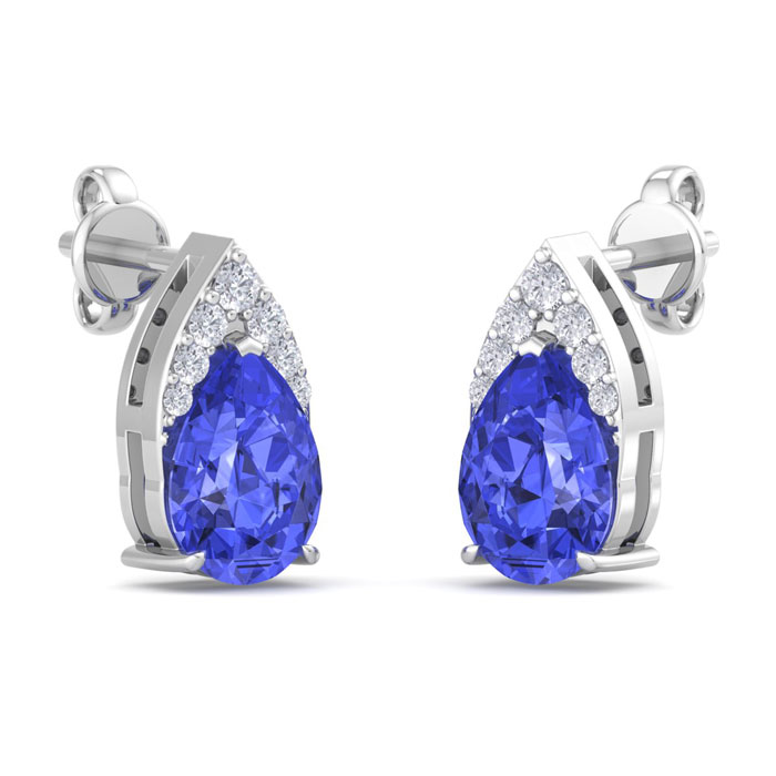 These gemstone earrings feature 2 sparkling pear shape tanzanite gemstones each weighing approximately 3/4 carats. They are surrounded with a crown of 14 diamonds totaling approximately 1/5 carat. Total carat weight is 1 3/4 carats. Diamond color is I-J, diamond clarity I1-I2. These earrings are in 14 karat white gold and have comfortable and secure post with friction backs.