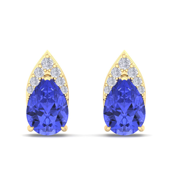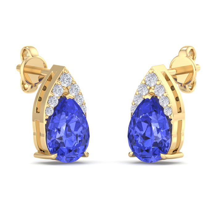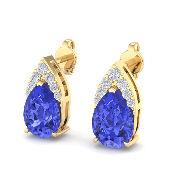 These gemstone earrings feature 2 sparkling pear shape tanzanite gemstones each weighing approximately 3/4 carats. They are surrounded with a crown of 14 diamonds totaling approximately 1/5 carat. Total carat weight is 1 3/4 carats. Diamond color is I-J, diamond clarity I1-I2. These earrings are in 14 karat yellow gold and have comfortable and secure post with friction backs.