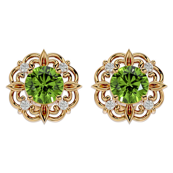 Retrograde Birthstones™ 1 3/4 Carat Peridot and Diamond Antique Stud Earrings In 14 Karat Yellow Gold