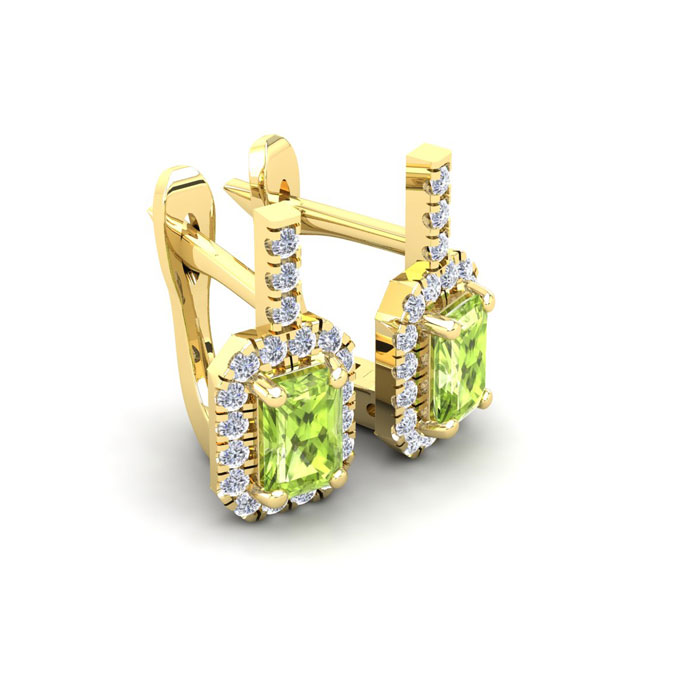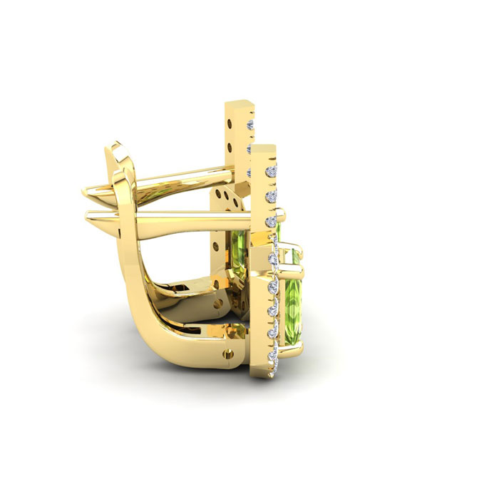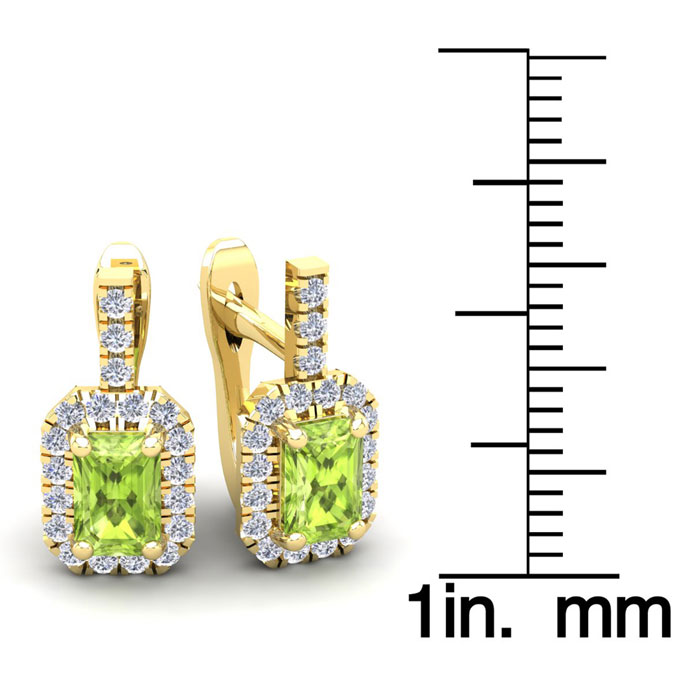 These stunning gemstone and halo diamond earrings feature two 6x4mm emerald cut peridot gemstones at 1.30 carats. The gemstones are surrounded by 38 sparkling diamonds in a halo in I-J color, SI2-I1 clarity at 0.48 carats. Total gem weight is 1.78 carats. These earrings are crafted in 14 karat yellow gold and come with comfortable and secure snap backs.
