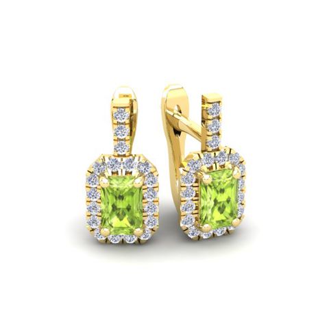 These stunning gemstone and halo diamond earrings feature two 6x4mm emerald cut peridot gemstones at 1.30 carats. The gemstones are surrounded by 38 sparkling diamonds in a halo in I-J color, SI2-I1 clarity at 0.48 carats. Total gem weight is 1.78 carats. These earrings are crafted in 14 karat yellow gold and come with comfortable and secure snap backs.