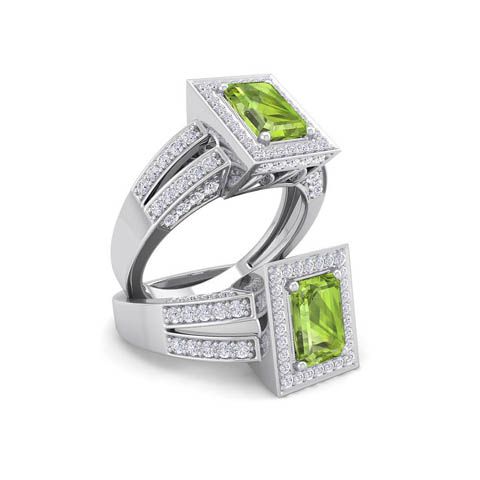 This elegant gemstone and diamond ring features one 7x5mm emerald cut peridot gemstone at approximately 1.15 carats. It is surrounded by 74 sparkling diamonds in I-J color, I1-I2 clarity at 0.62 carat total weight. Total gem weight is approximately 1 3/4 carats. This ring is in 14 karat white gold.