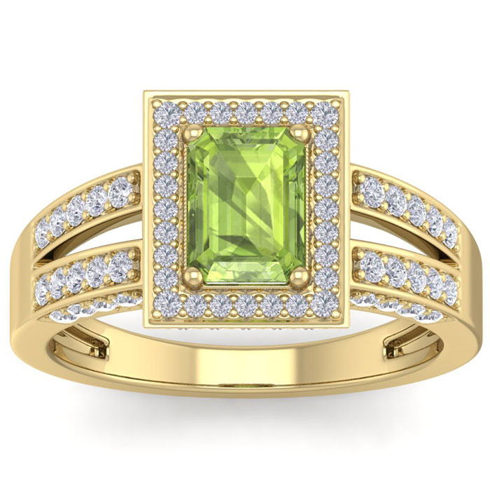 This elegant gemstone and diamond ring features one 7x5mm emerald cut peridot gemstone at approximately 1.15 carats. It is surrounded by 74 sparkling diamonds in I-J color, I1-I2 clarity at 0.62 carat total weight. Total gem weight is approximately 1 3/4 carats. This ring is in 14 karat yellow gold.