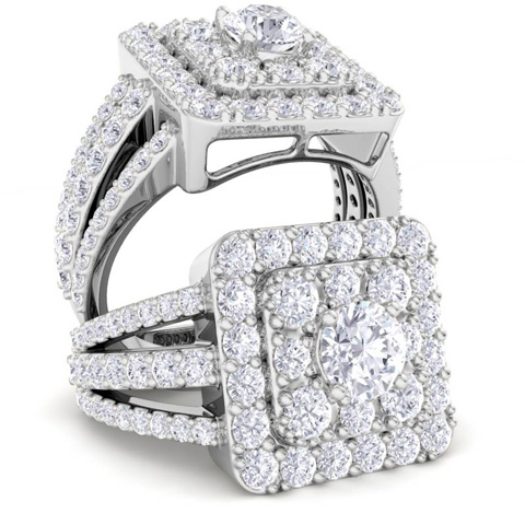 This stunning halo diamond engagement ring will really impress her, with the look of a princess cut diamond ring. This ring features a 1/2 carat center round shape diamond in H-I color, and SI2-I1 clarity. It is surrounded by 72 sparkling diamonds totaling at 1.32 carats in H-I color, SI2-I1 clarity. Total gem weight is 1.80 carats. Ring top measures 14x14mm and this ring is crafted in 14 karat white gold.
