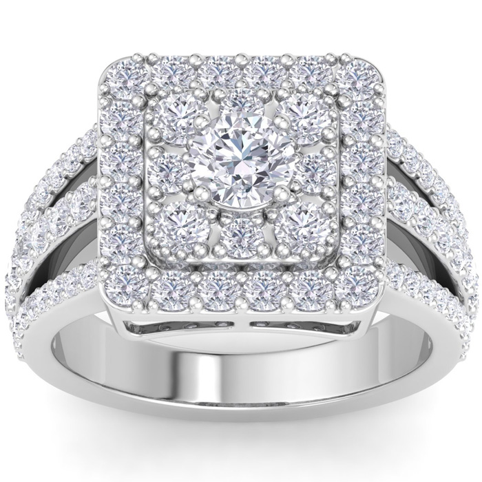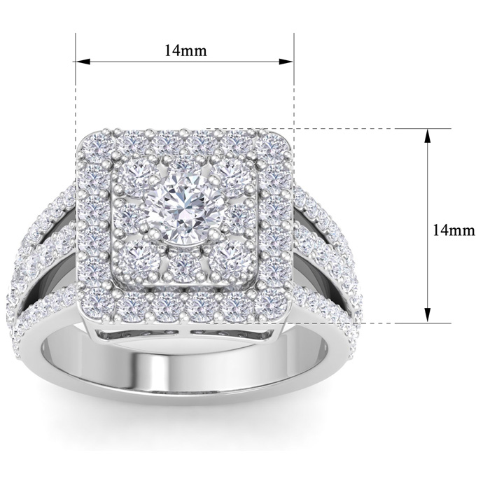 This stunning halo diamond engagement ring will really impress her, with the look of a princess cut diamond ring. This ring features a 1/2 carat center round shape diamond in H-I color, and SI2-I1 clarity. It is surrounded by 72 sparkling diamonds totaling at 1.32 carats in H-I color, SI2-I1 clarity. Total gem weight is 1.80 carats. Ring top measures 14x14mm and this ring is crafted in 14 karat white gold.