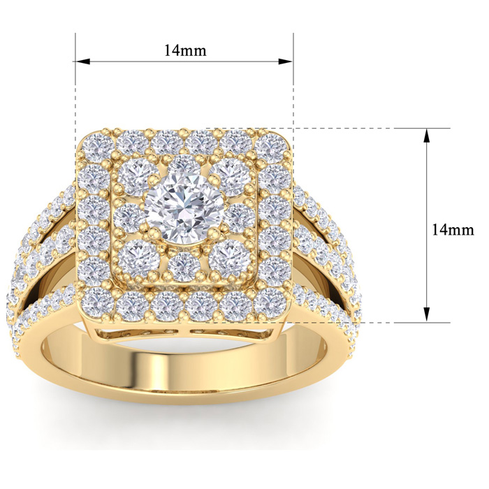 This stunning halo diamond engagement ring will really impress her, with the look of a princess cut diamond ring. This ring features a 1/2 carat center round shape diamond in H-I color, and SI2-I1 clarity. It is surrounded by 72 sparkling diamonds totaling at 1.32 carats in H-I color, SI2-I1 clarity. Total gem weight is 1.80 carats. Ring top measures 14x14mm and this ring is crafted in 14 karat yellow gold.