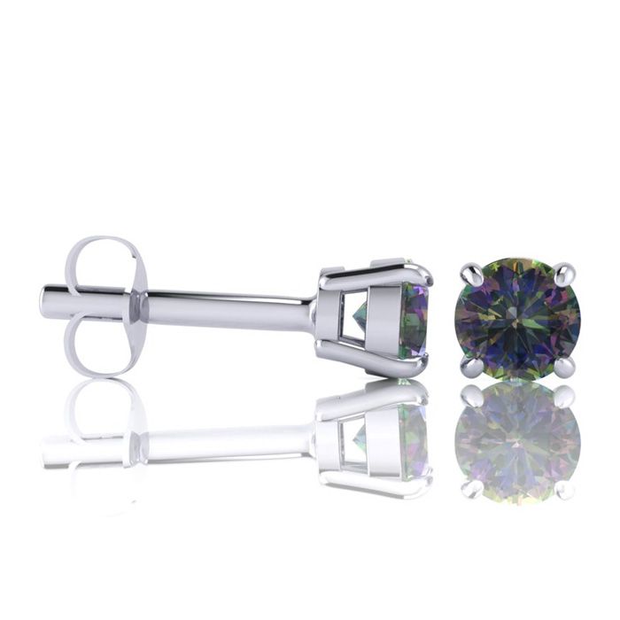 These classic stud earrings feature two 5x5mm round shape mystic topaz gemstones. Each stone measures approximately 0.90 carats for a total approximate weight of 1.80 carats. These earrings are in sterling silver and have comfortable and secure post with friction backs.