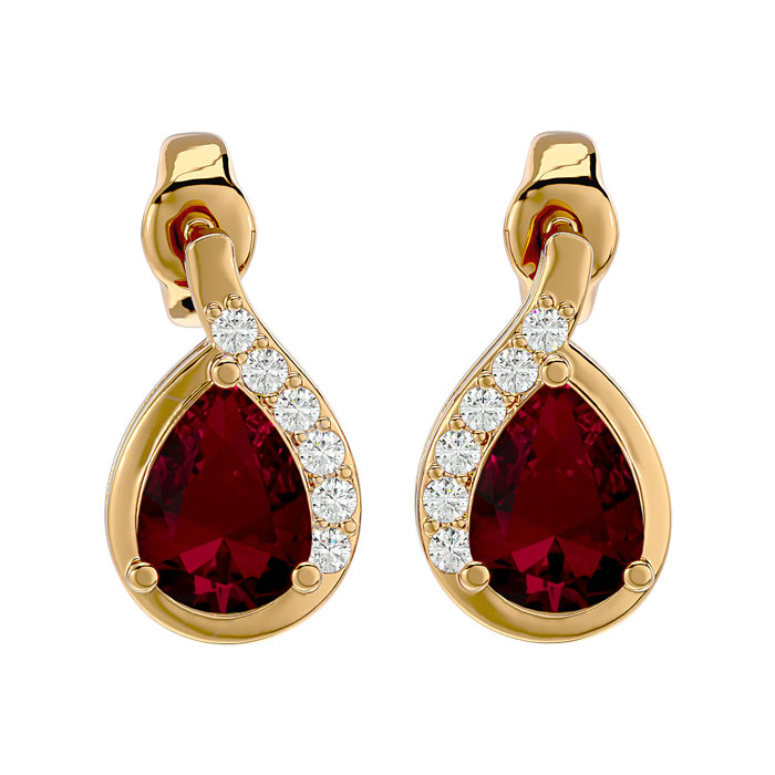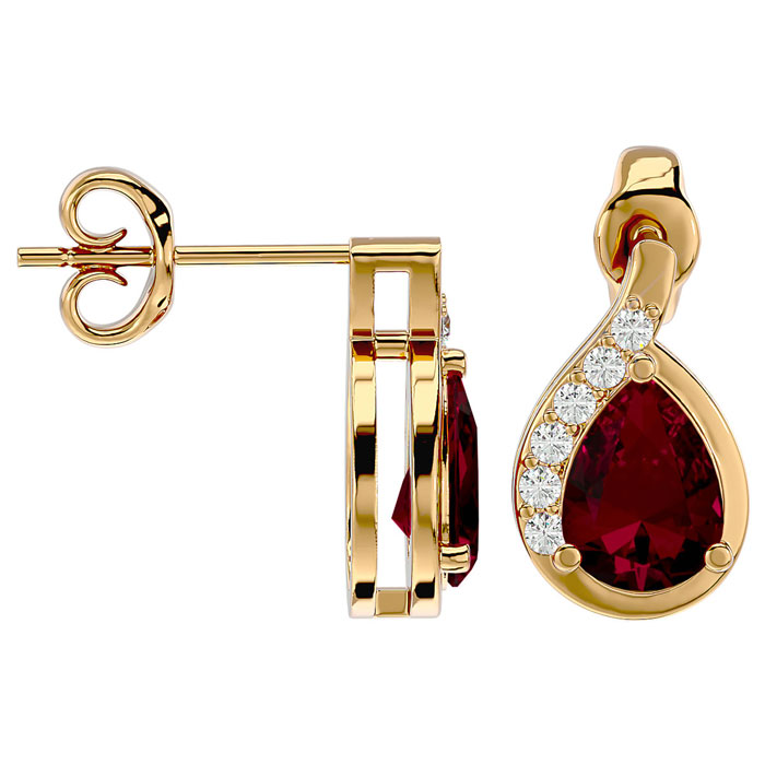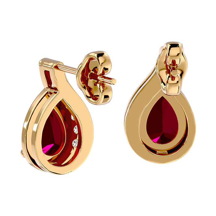 These elegant gemstone earrings feature two 7x5mm pear shape ruby gemstones at approximately 1.60 carats. They are surrounded by 12 sparkling diamonds in I-J color, I1-I2 clarity at 1/10 carat total weight. Total gem weight is approximately 1 3/4 carats. These earrings are in 14 karat yellow gold and have comfortable and secure friction backs.