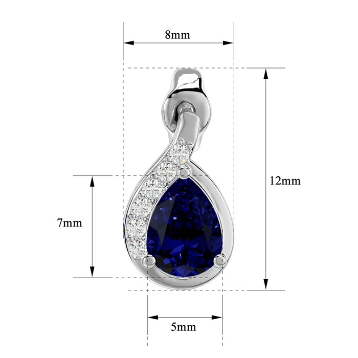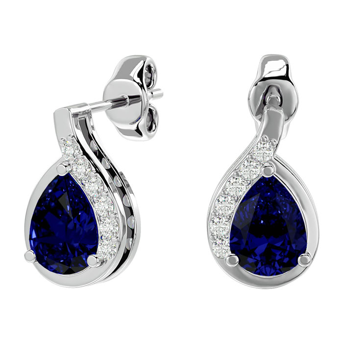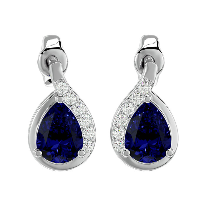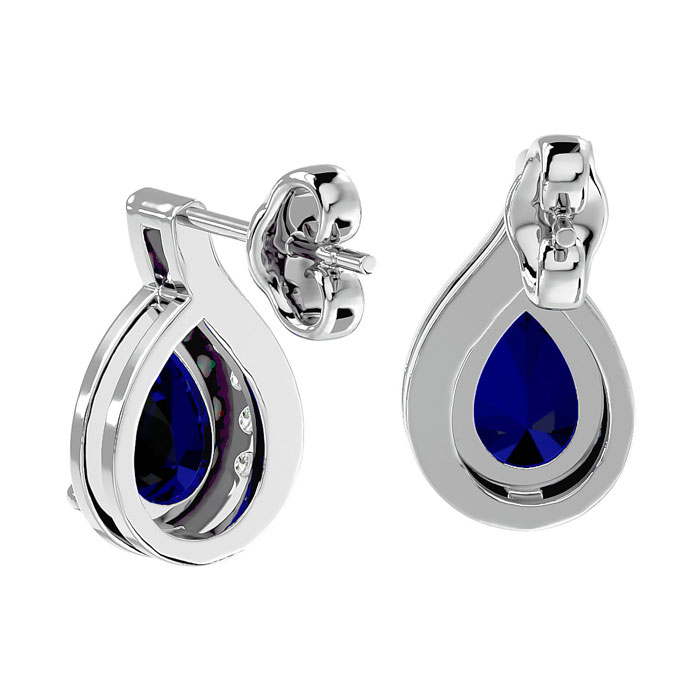 These elegant gemstone earrings feature two 7x5mm pear shape sapphire gemstones at approximately 1.70 carats. They are surrounded by 12 sparkling diamonds in I-J color, I1-I2 clarity at 1/10 carat total weight. Total gem weight is approximately 1 3/4 carats. These earrings are in 14 karat white gold and have comfortable and secure friction backs.