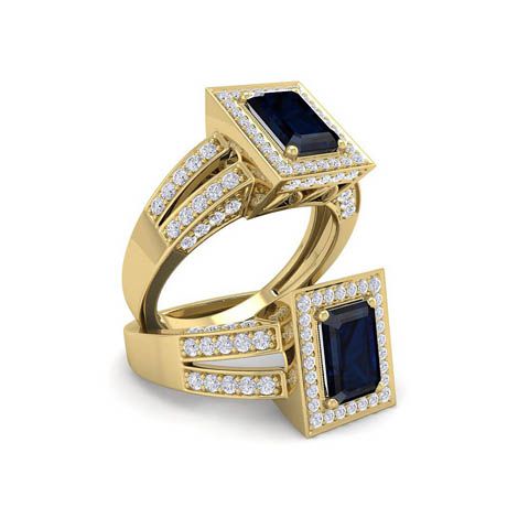 This elegant gemstone and diamond ring features one 7x5mm emerald cut sapphire gemstone at approximately 1.15 carats. It is surrounded by 74 sparkling diamonds in I-J color, I1-I2 clarity at 0.62 carat total weight. Total gem weight is approximately 1 3/4 carats. This ring is in 14 karat yellow gold.