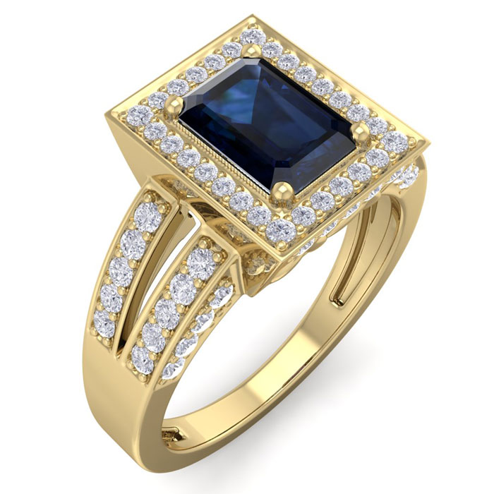 This elegant gemstone and diamond ring features one 7x5mm emerald cut sapphire gemstone at approximately 1.15 carats. It is surrounded by 74 sparkling diamonds in I-J color, I1-I2 clarity at 0.62 carat total weight. Total gem weight is approximately 1 3/4 carats. This ring is in 14 karat yellow gold.