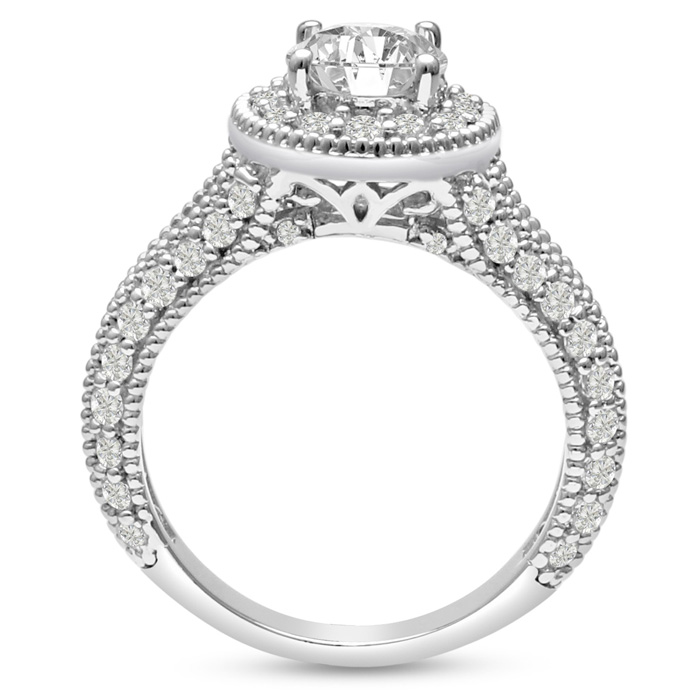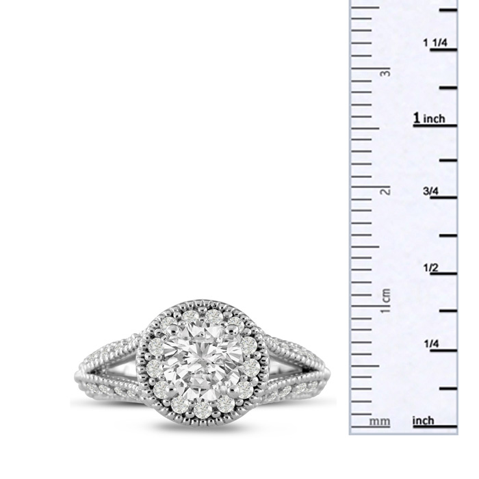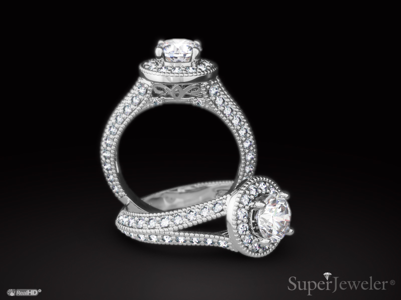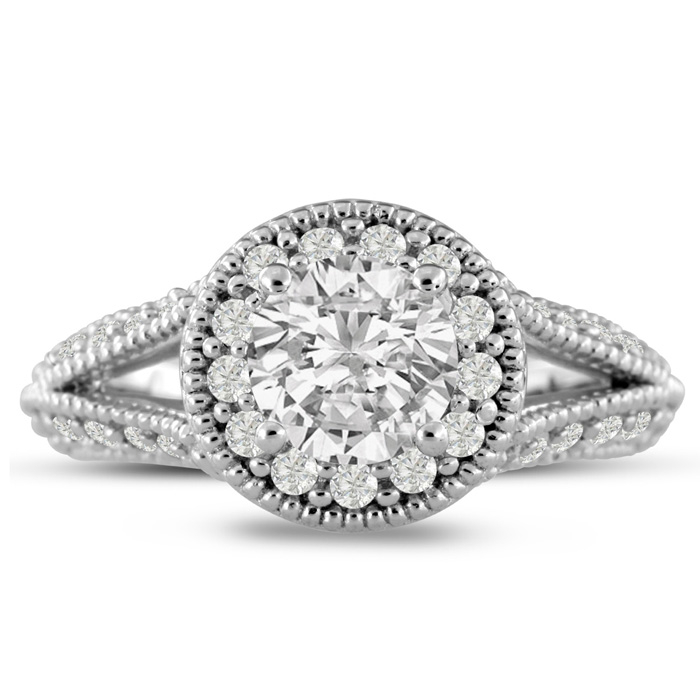 This ring is the definiton of timeless beauty, with all of the intricate riveting detail, the split shank with diamonds adorning every angle, and a round brilliant stone surrounded with a halo of smaller stones, the attention is all in the details on this ring.