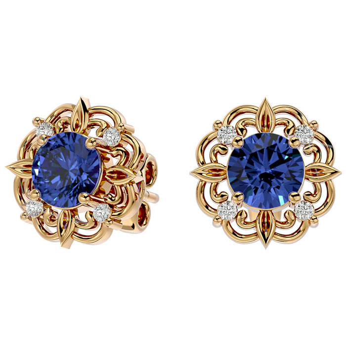 Retrograde Birthstones™ 1 3/4 Carat Tanzanite and Diamond Antique Stud Earrings In 14 Karat Yellow Gold