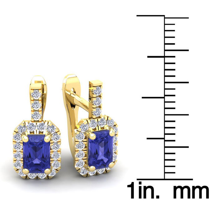 These stunning gemstone and halo diamond earrings feature two 6x4mm emerald cut tanzanite gemstones at 1.30 carats. The gemstones are surrounded by 38 sparkling diamonds in a halo in I-J color, SI2-I1 clarity at 0.48 carats. Total gem weight is 1.78 carats. These earrings are crafted in 14 karat yellow gold and come with comfortable and secure snap backs.