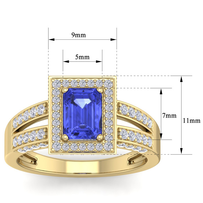 This elegant gemstone and diamond ring features one 7x5mm emerald cut tanzanite gemstone at approximately 1.15 carats. It is surrounded by 74 sparkling diamonds in I-J color, I1-I2 clarity at 0.62 carat total weight. Total gem weight is approximately 1 3/4 carats. This ring is in 14 karat yellow gold.