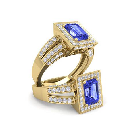 This elegant gemstone and diamond ring features one 7x5mm emerald cut tanzanite gemstone at approximately 1.15 carats. It is surrounded by 74 sparkling diamonds in I-J color, I1-I2 clarity at 0.62 carat total weight. Total gem weight is approximately 1 3/4 carats. This ring is in 14 karat yellow gold.