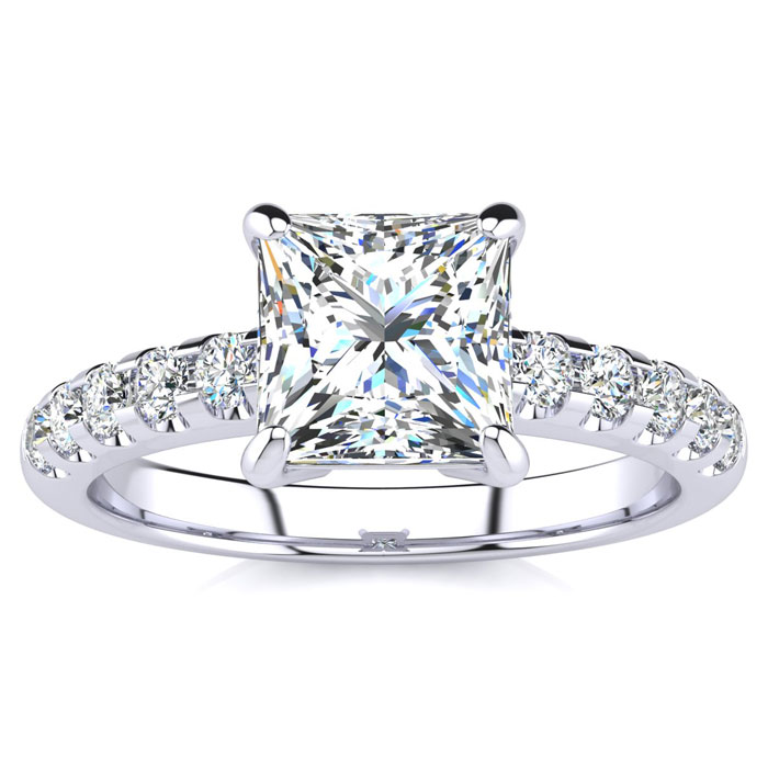 The perfect and most traditional diamond engagement ring for the lady who wants a diamond ring that is always in style. Featuring a princess cut brilliant 1 1/2 carat clarity enhanced solitaire diamond and 10 side diamonds of 3 points each, this ring is 1.80 carats total diamond weight, set in solid 14 karat white gold. Available in ring sizes from 4 to 9.5.