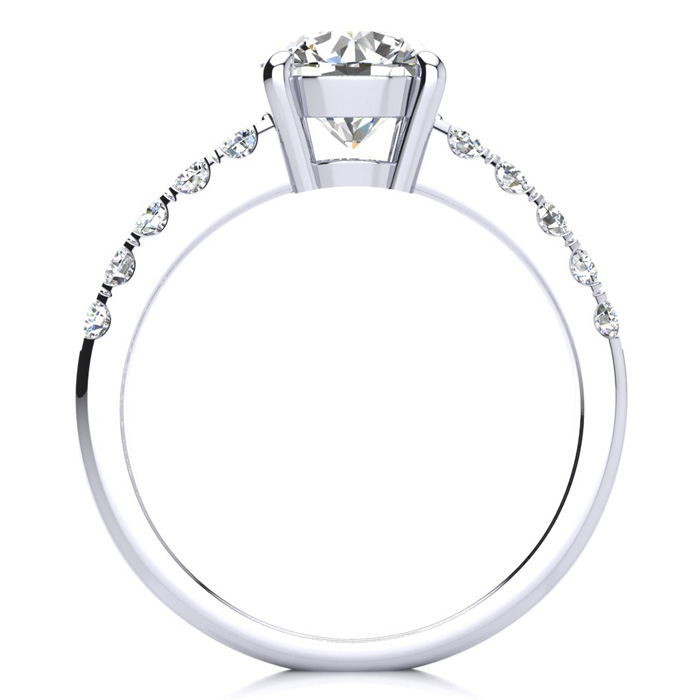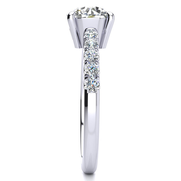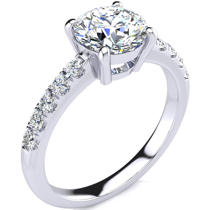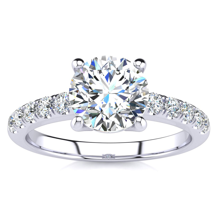 The perfect and most traditional diamond engagement ring for the lady who wants a diamond ring that is always in style. Featuring a round brilliant 1 1/2 carat clarity enhanced solitaire diamond and 10 side diamonds of 3 points each, this ring is 1.80 carats total diamond weight, set in solid 14 karat white gold. Available in ring sizes from 4 to 9.5.