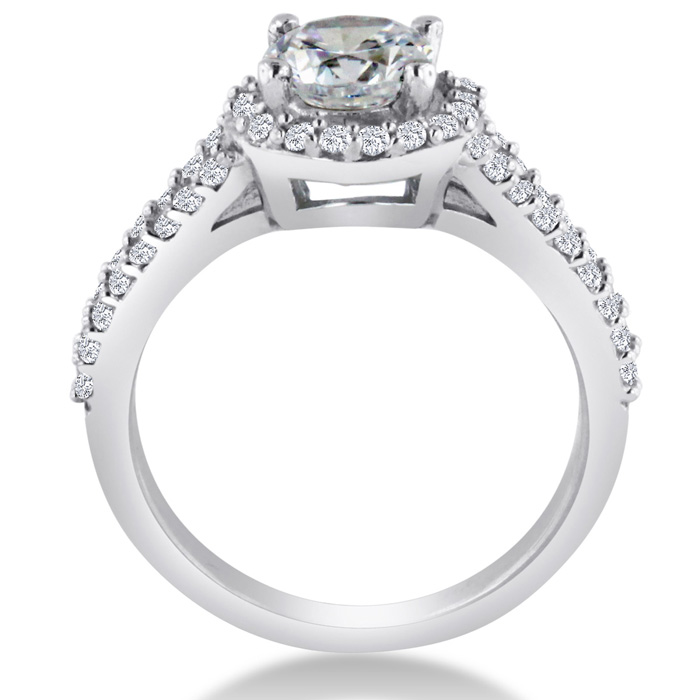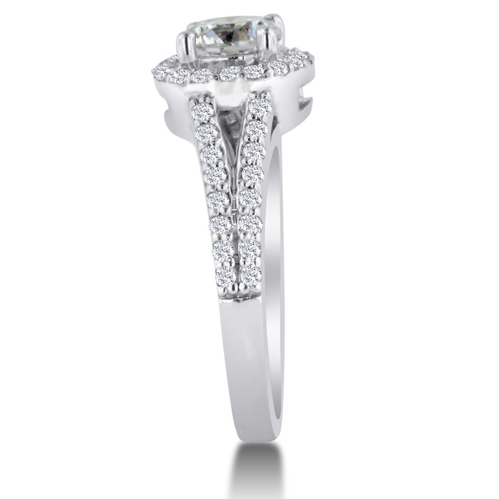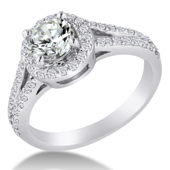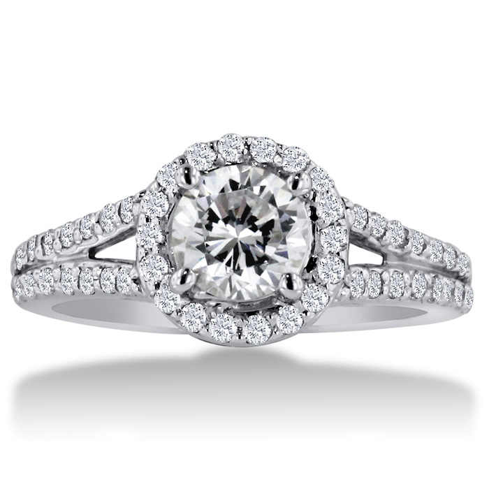 This simple halo setting with a split shank is absolutely stunning, very flashy but still very dainty!