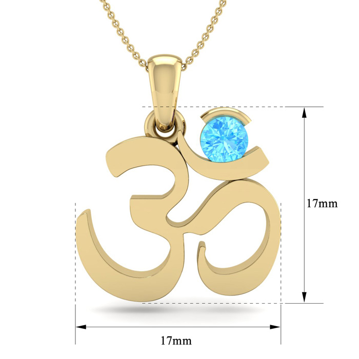 This elegant gemstone Om necklace features one 4mm blue topaz gemstone at approximately 1/3 carat. This necklace is in 14 karat yellow gold. This necklace comes with an 18 inch cable chain with a spring-ring clasp.