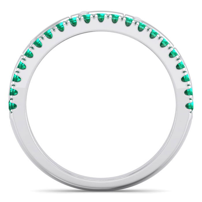 This elegant gemstone band features 21 sparkling emerald gemstones parallel to a cross band. Total carat weight is 1/3 carat. This split shank band is 5mm wide and is in 14 karat white gold.