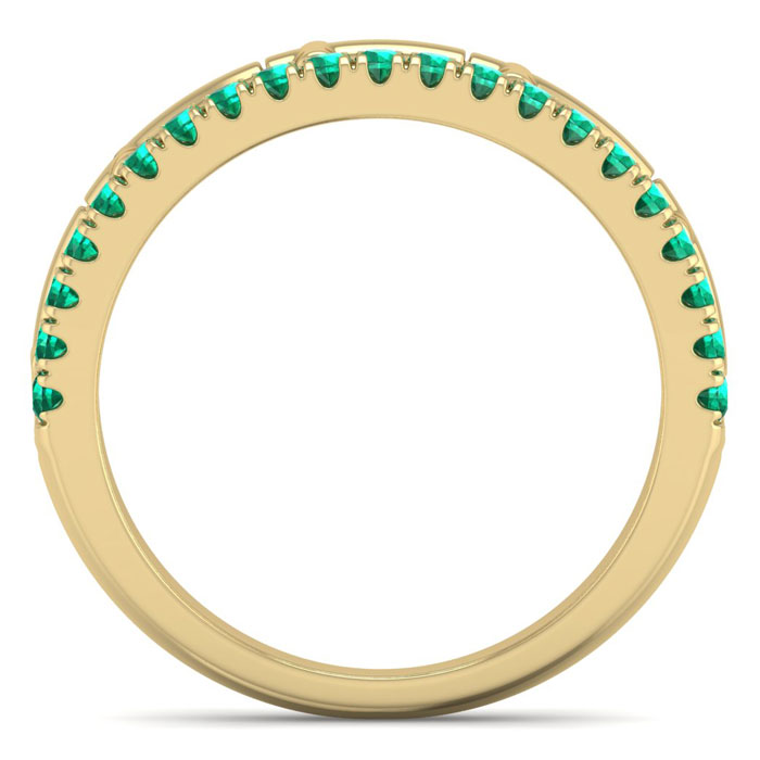 This elegant gemstone band features 21 sparkling emerald gemstones parallel to a cross band. Total carat weight is 1/3 carat. This split shank band is 5mm wide and is in 14 karat yellow gold.
