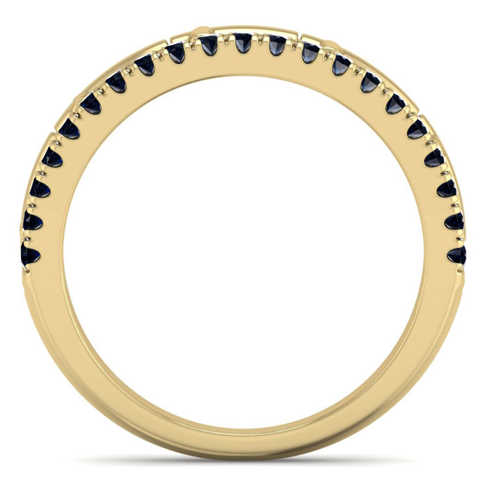 This elegant gemstone band features 21 sparkling sapphire gemstones parallel to a cross band. Total carat weight is 1/3 carat. This split shank band is 5mm wide and is in 14 karat yellow gold.