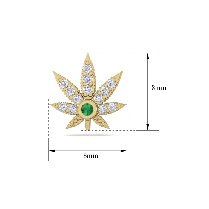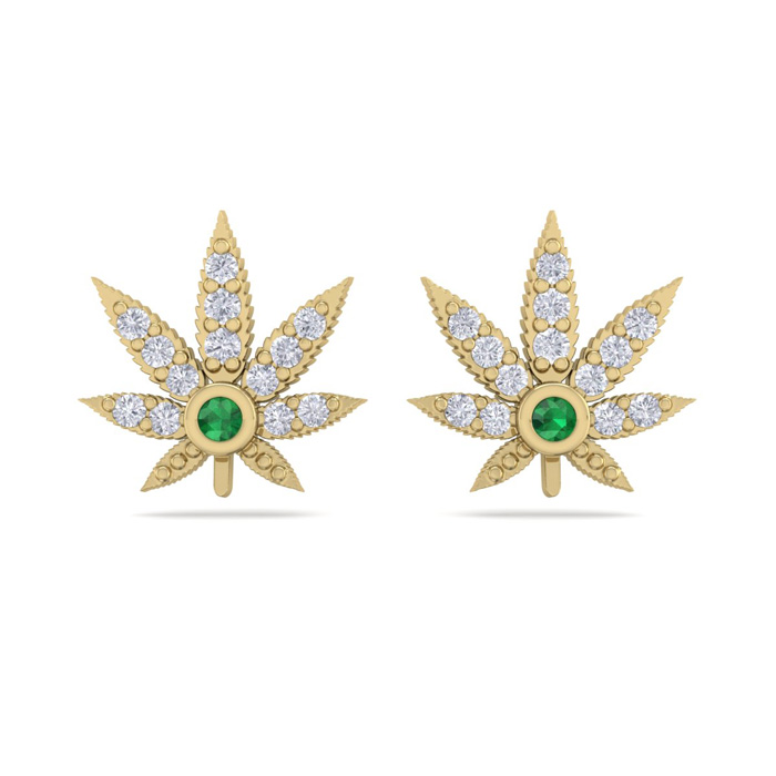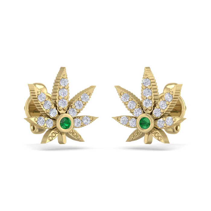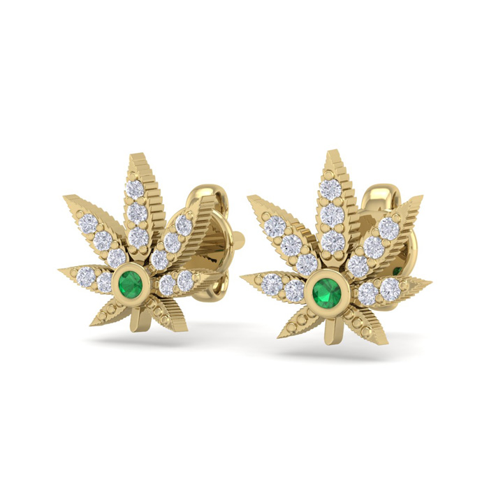 These emerald and diamond earrings feature a cannabis leaf design. They are adorned with 26 diamonds in H-I color, I1-I2 clarity and two emerald gemstones. Total carat weight is 1/4 carat. These earrings are 8x8mm and are in 14 karat yellow gold. They have comfortable and secure post with friction backs.