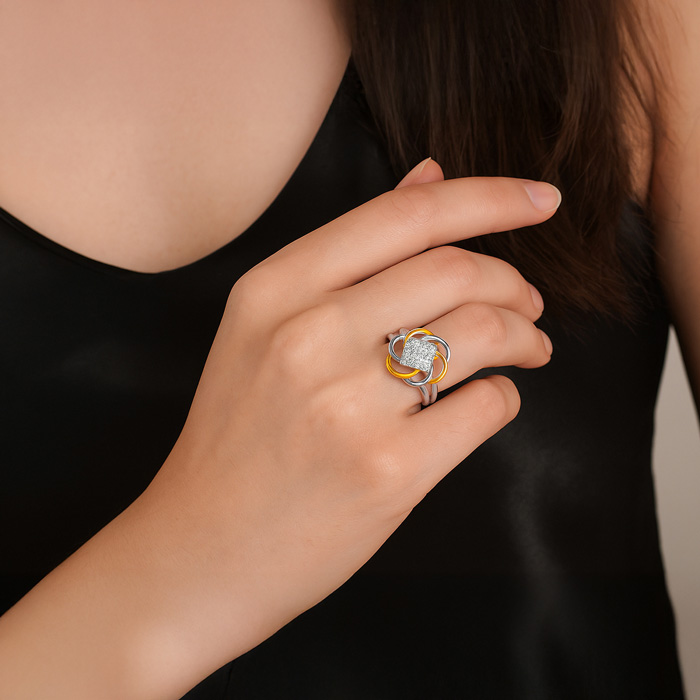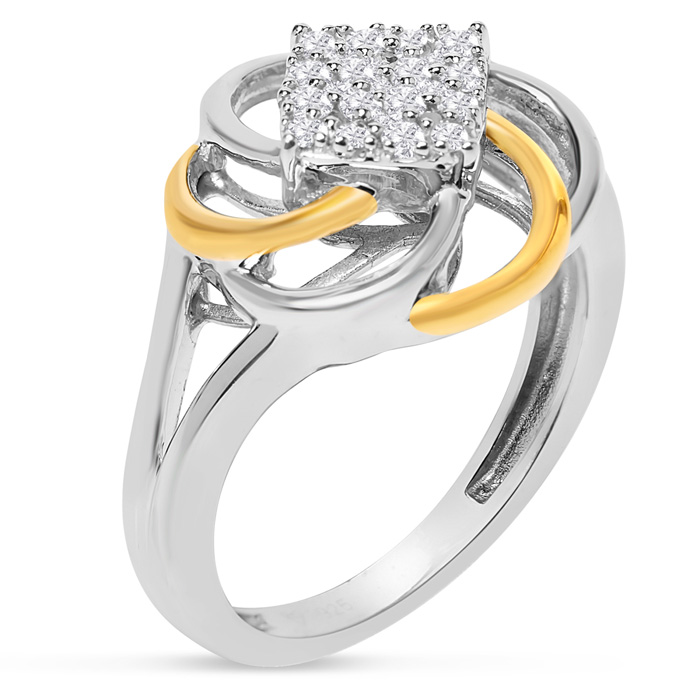 This amazing diamond ring features 16 sparkling diamonds in H-I color, I2-I3 clarity weighing 1/4 carat. The widest part of the ring is 15mm. This ring is in two tone sterling silver.