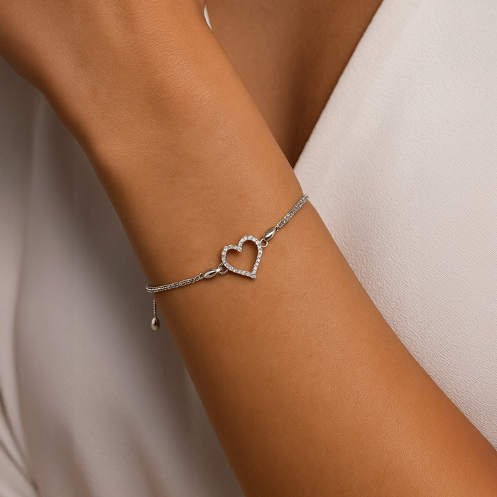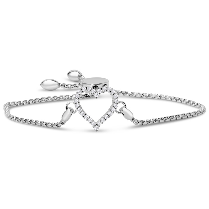1/4 Carat Diamond Heart Bracelet In Sterling Silver, Adjustable 6-9 Inches