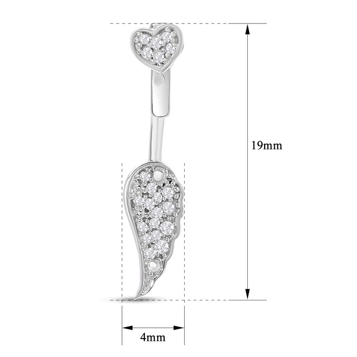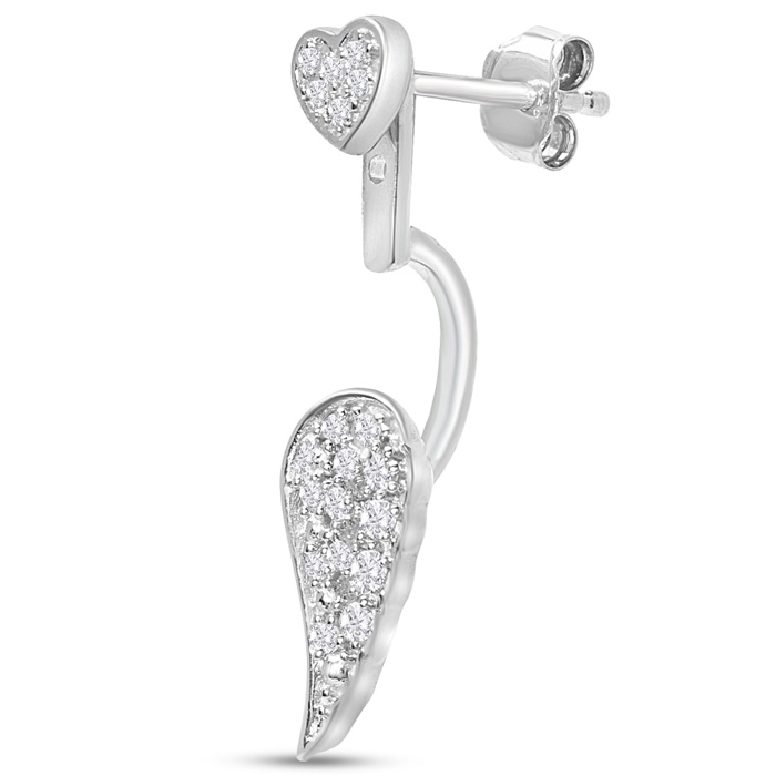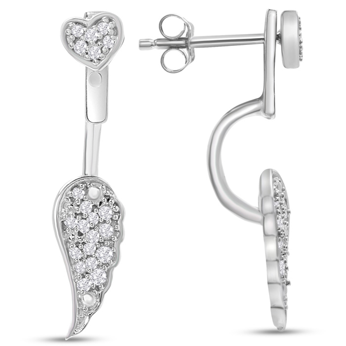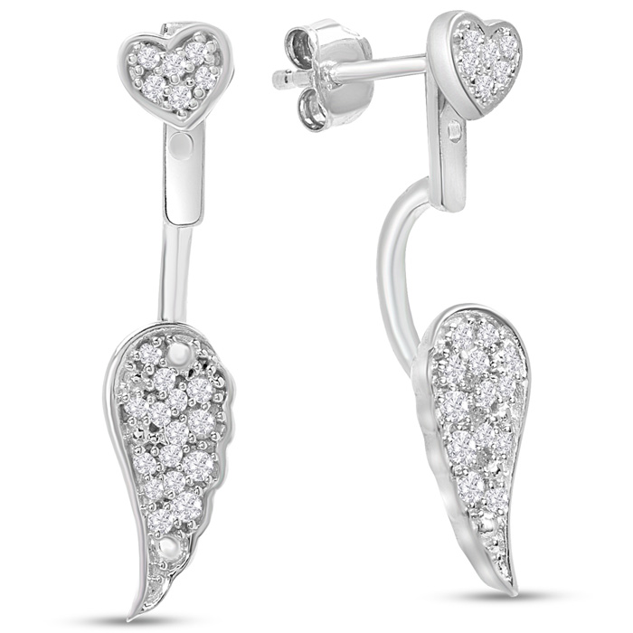 1/4 Carat Diamond Heart Drop Earrings With Angel Wings Jackets In Sterling Silver, 3/4 Inch