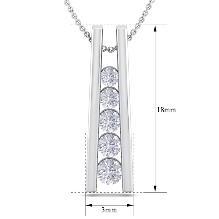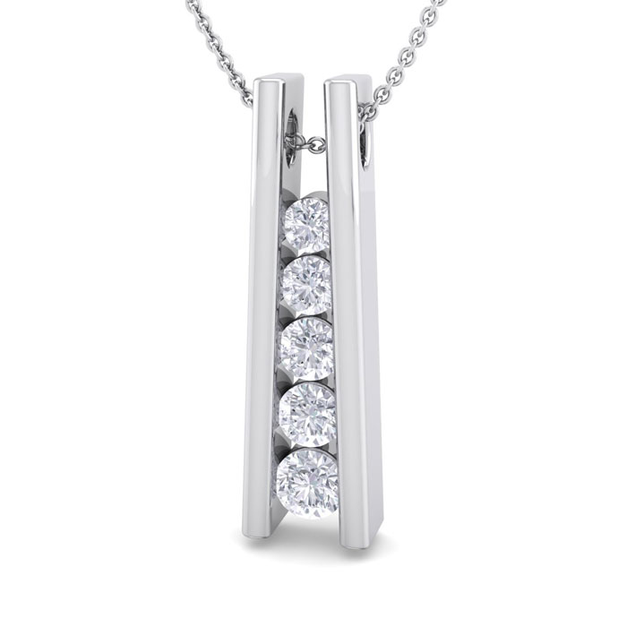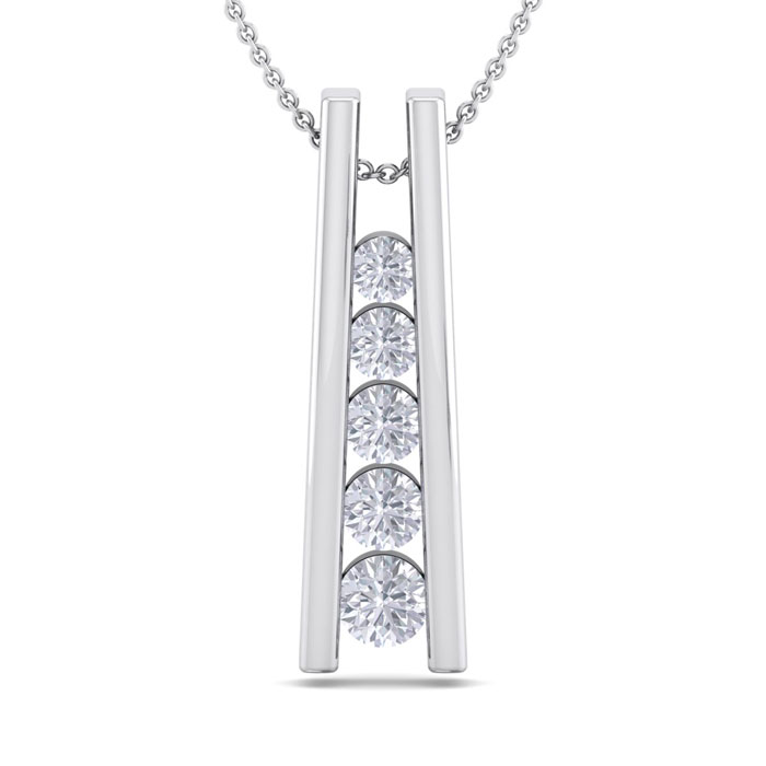 This elegant diamond necklace features 5 sparkling graduated diamonds in I-J color, I1-I2 clarity at 1/4 carat total weight. This necklace is in 14 karat white gold. This necklace comes with an 18 inch cable chain with a spring-ring clasp.