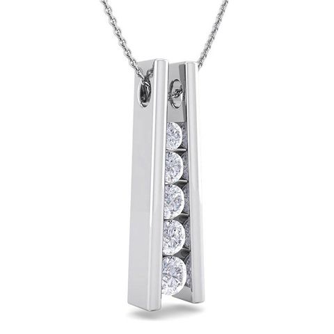 This elegant diamond necklace features 5 sparkling graduated diamonds in I-J color, I1-I2 clarity at 1/4 carat total weight. This necklace is in 14 karat white gold. This necklace comes with an 18 inch cable chain with a spring-ring clasp.