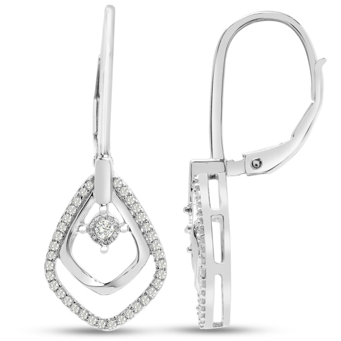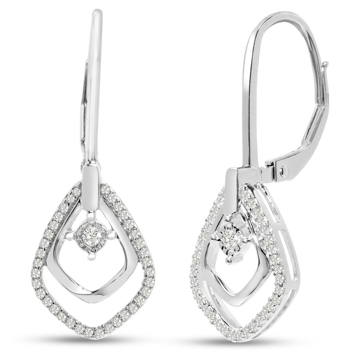 These diamond drop earrings feature 66 sparkling diamonds in I-J color, I1-I2 clarity weighing 1/4 carat. These earrings drop down 1 inch and are in sterling silver with lever backs.